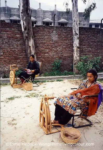Hand spinning naturally dyed wool in Kullu, Himalchal Pradesh, India.